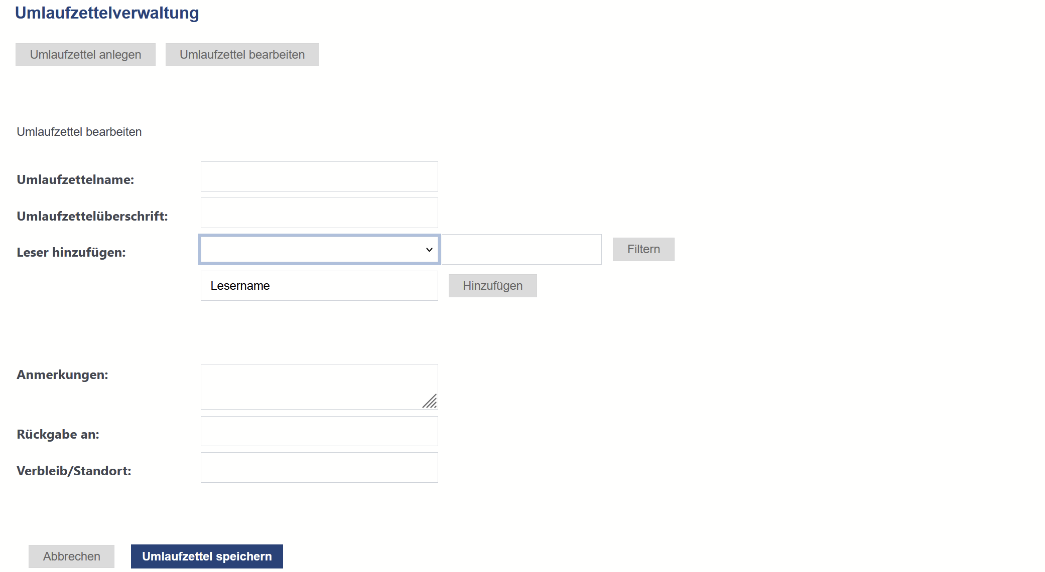 gelangen Sie zur Umlaufzettelverwaltung. Dieses